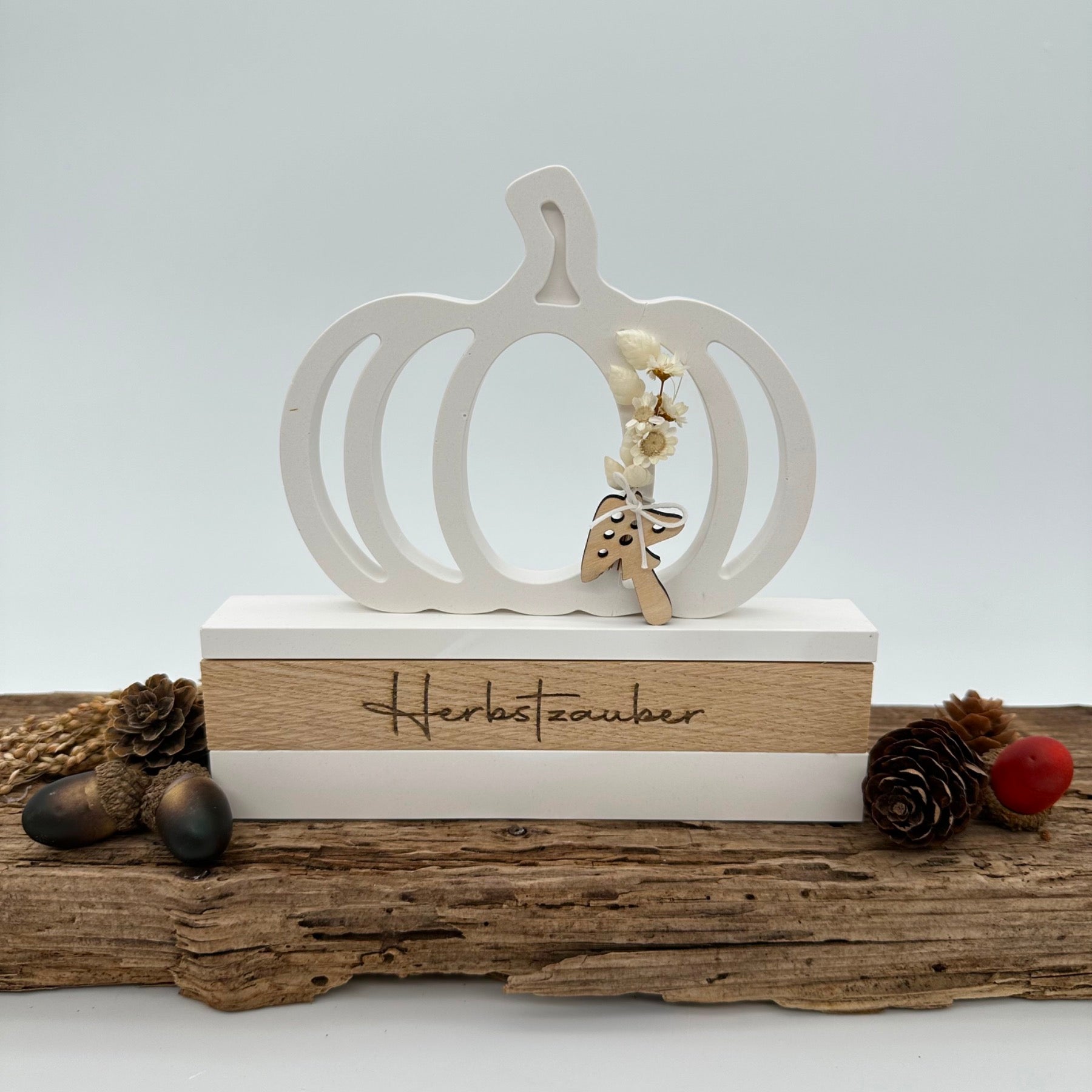 Du kannst diese als 2-1 Form nutzen und einfach umdrehen. Die Baumkerzenöffnungen zeigen zum Boden und du hast oben eine grade Fläche um was anderes aufzukleben (siehe Bild mit Kürbis)